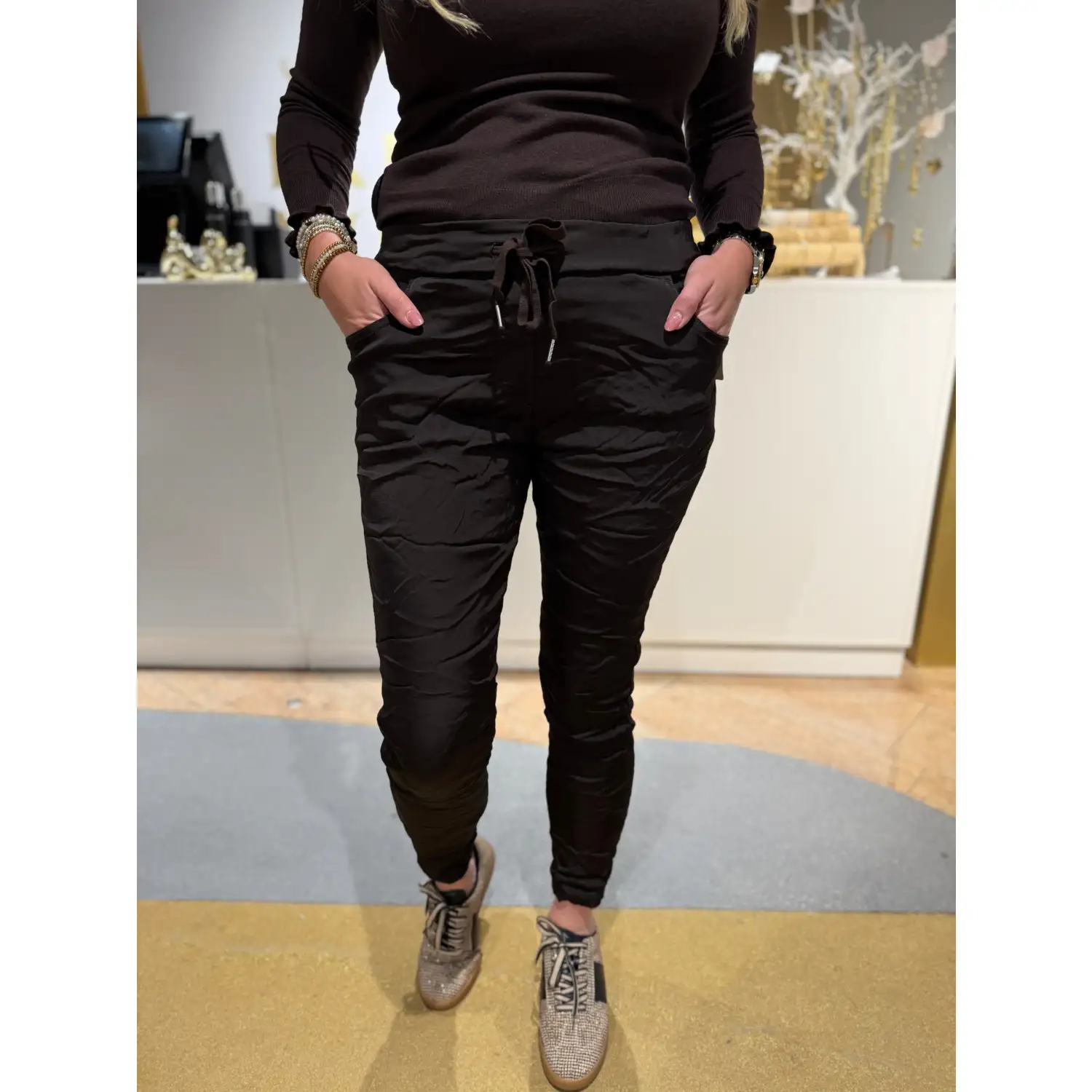 Donkerbruine broek met stretch en glans One Size