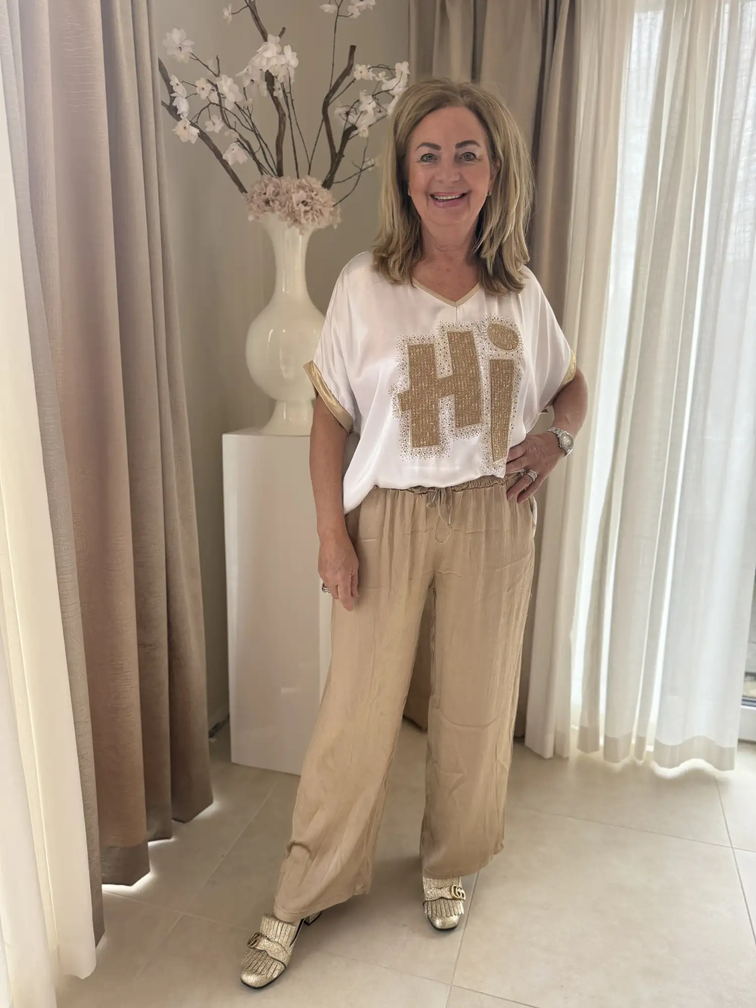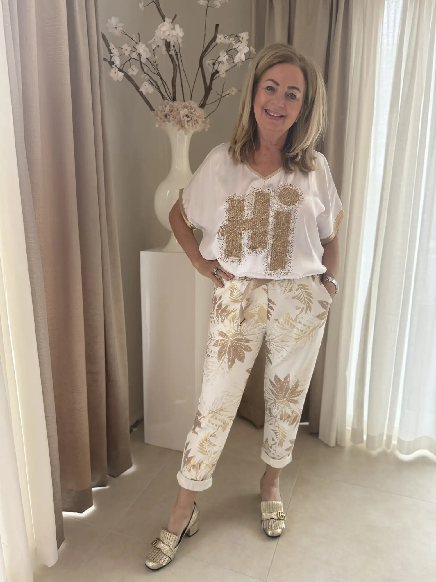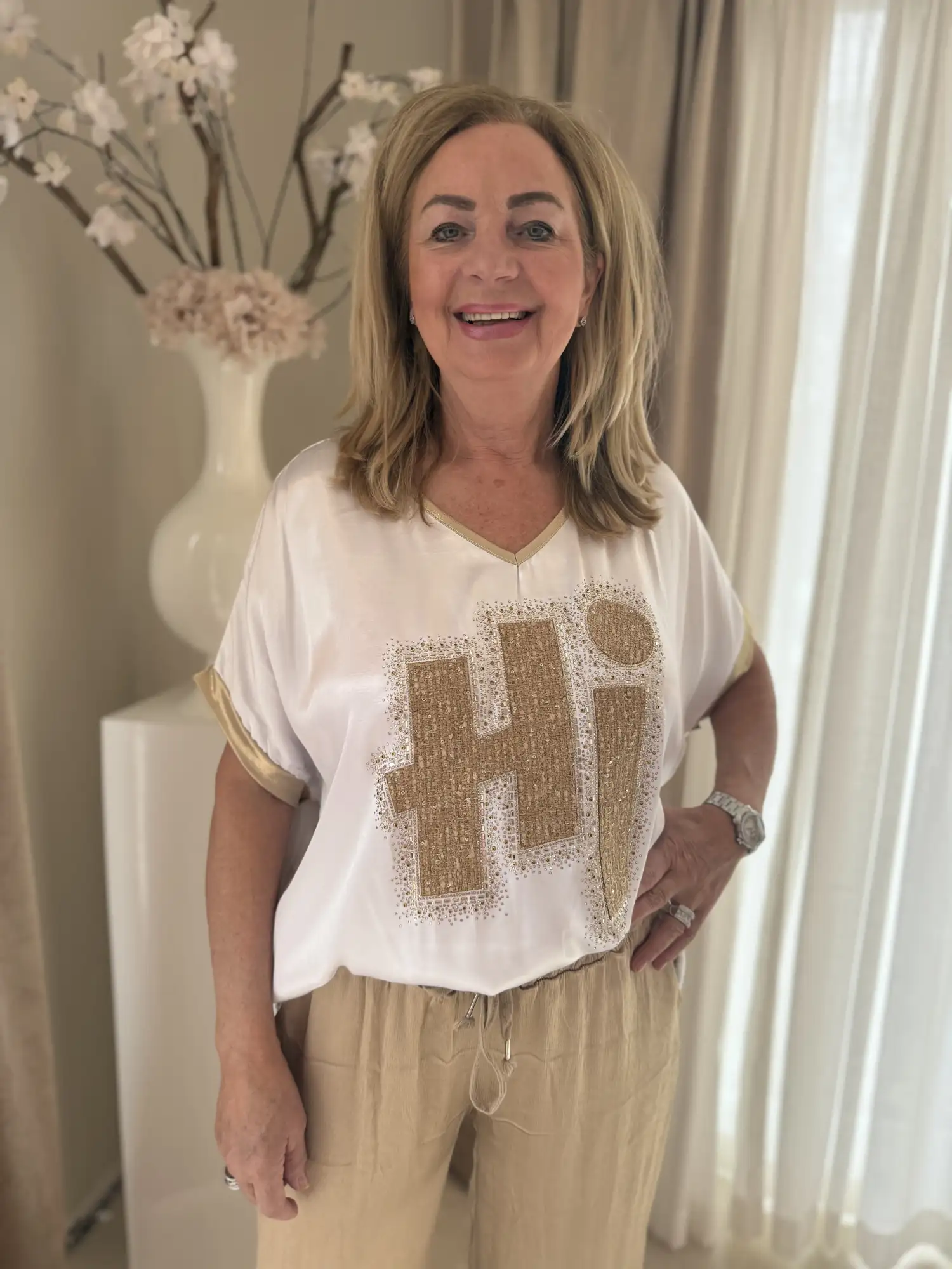 Wit shirt met de tekst HI erop.