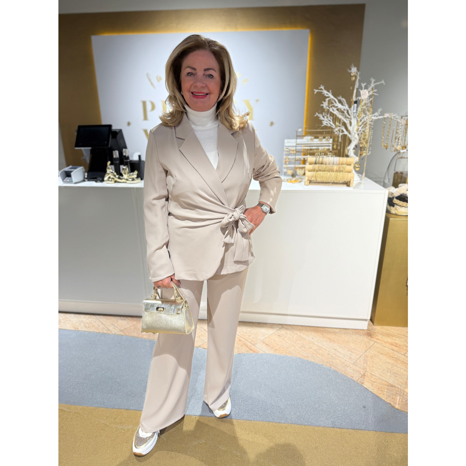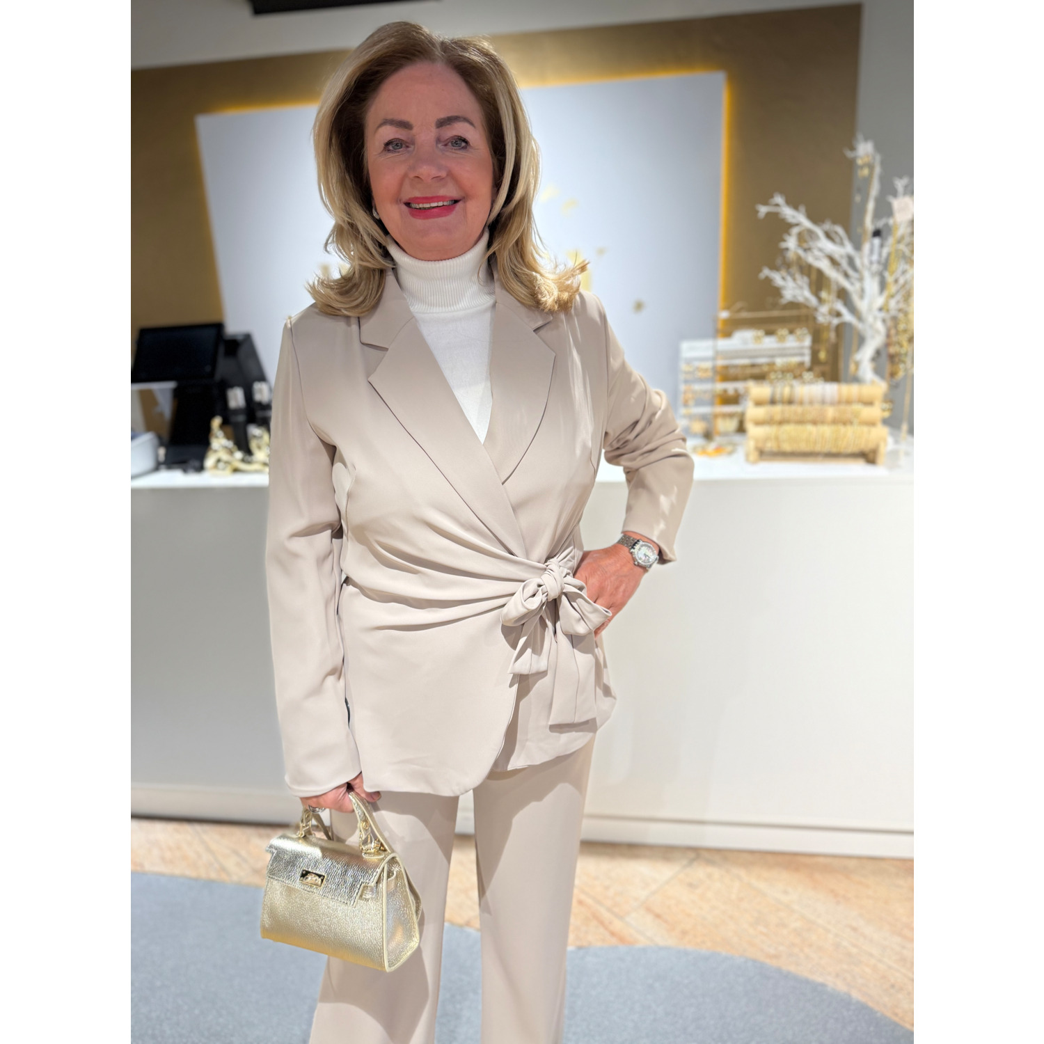 Beige blazer die je dmv een strik kan sluiten recht model