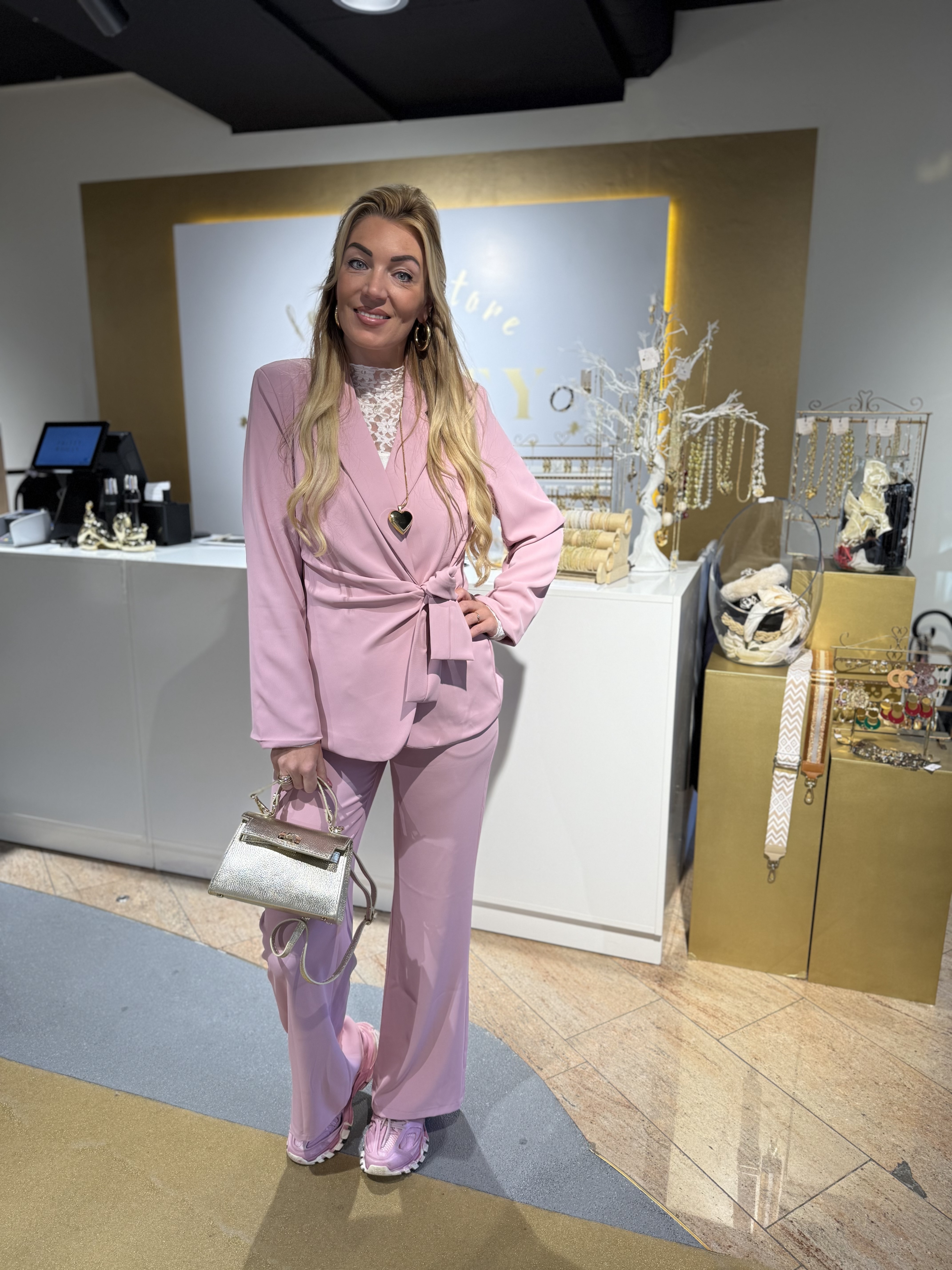 Mooie roze blazer die je dmv een strik kan sluiten.