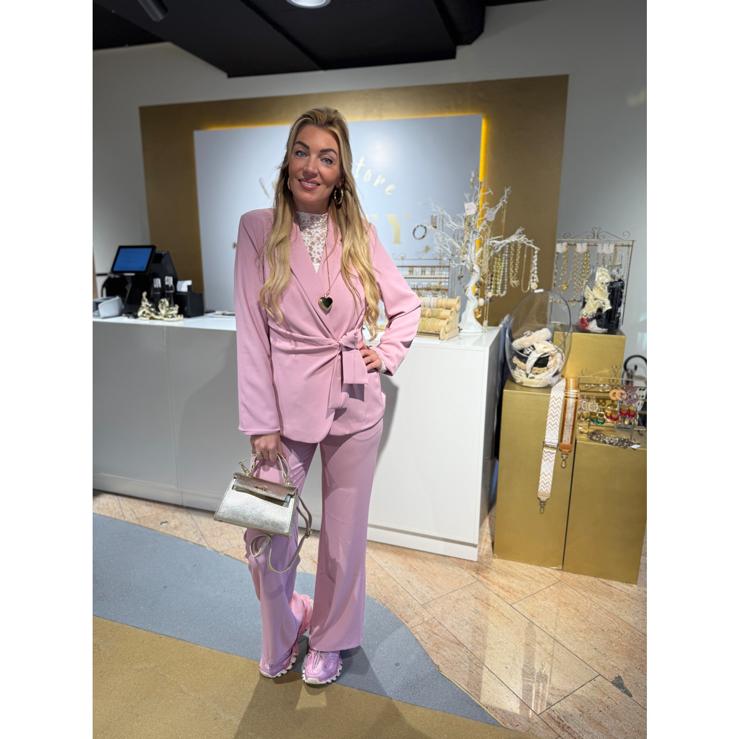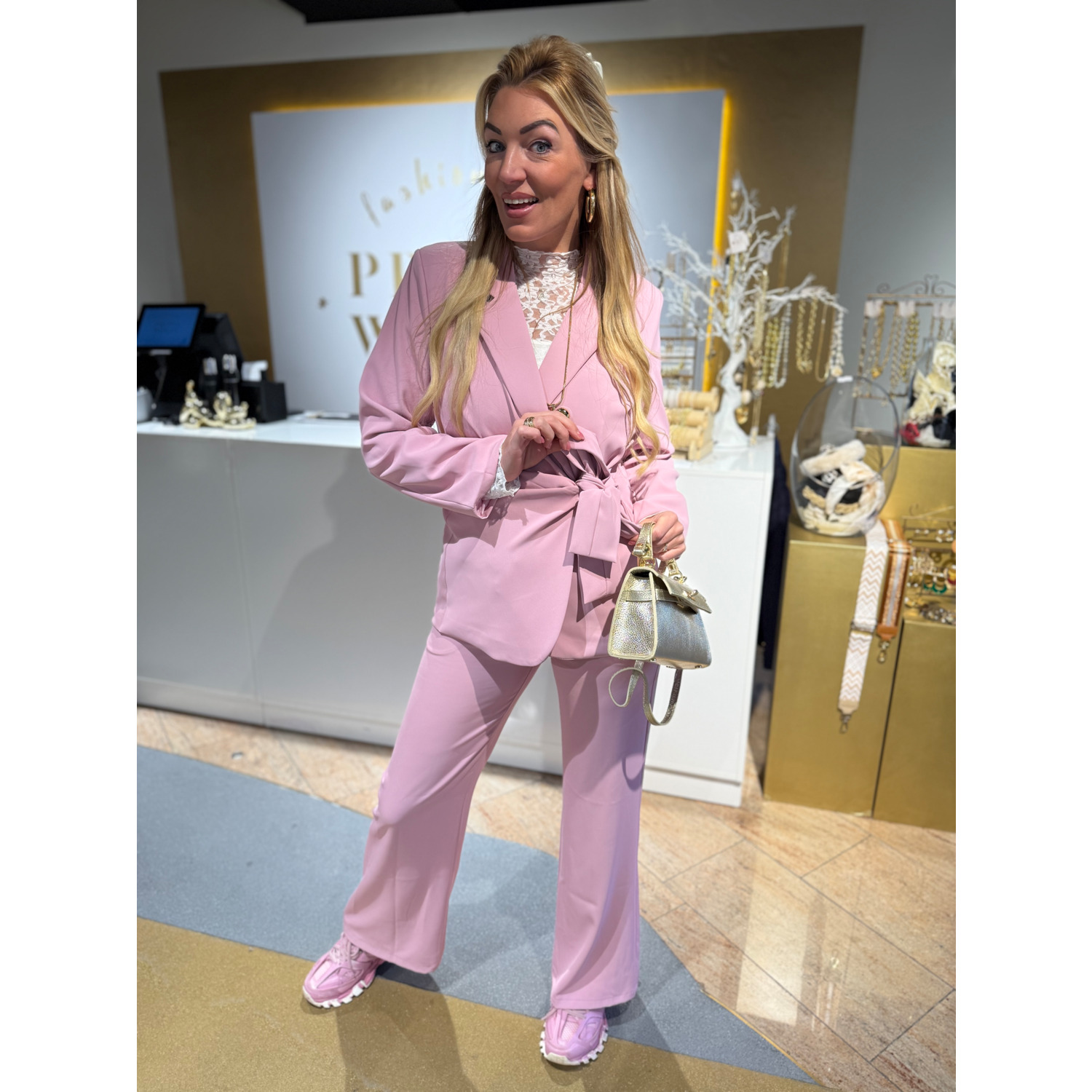Mooie roze blazer die je dmv een strik kan sluiten. Bijpassende pantalon verkrijgbaar